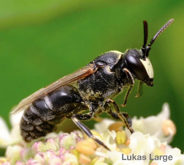 A small, slender bee with a shiny black body. Males display distinctive white or yellow face markings that resemble a ‘mask.’ Unlike many bees, this species has very little body hair, which can lead to confusion with wasps or flies.